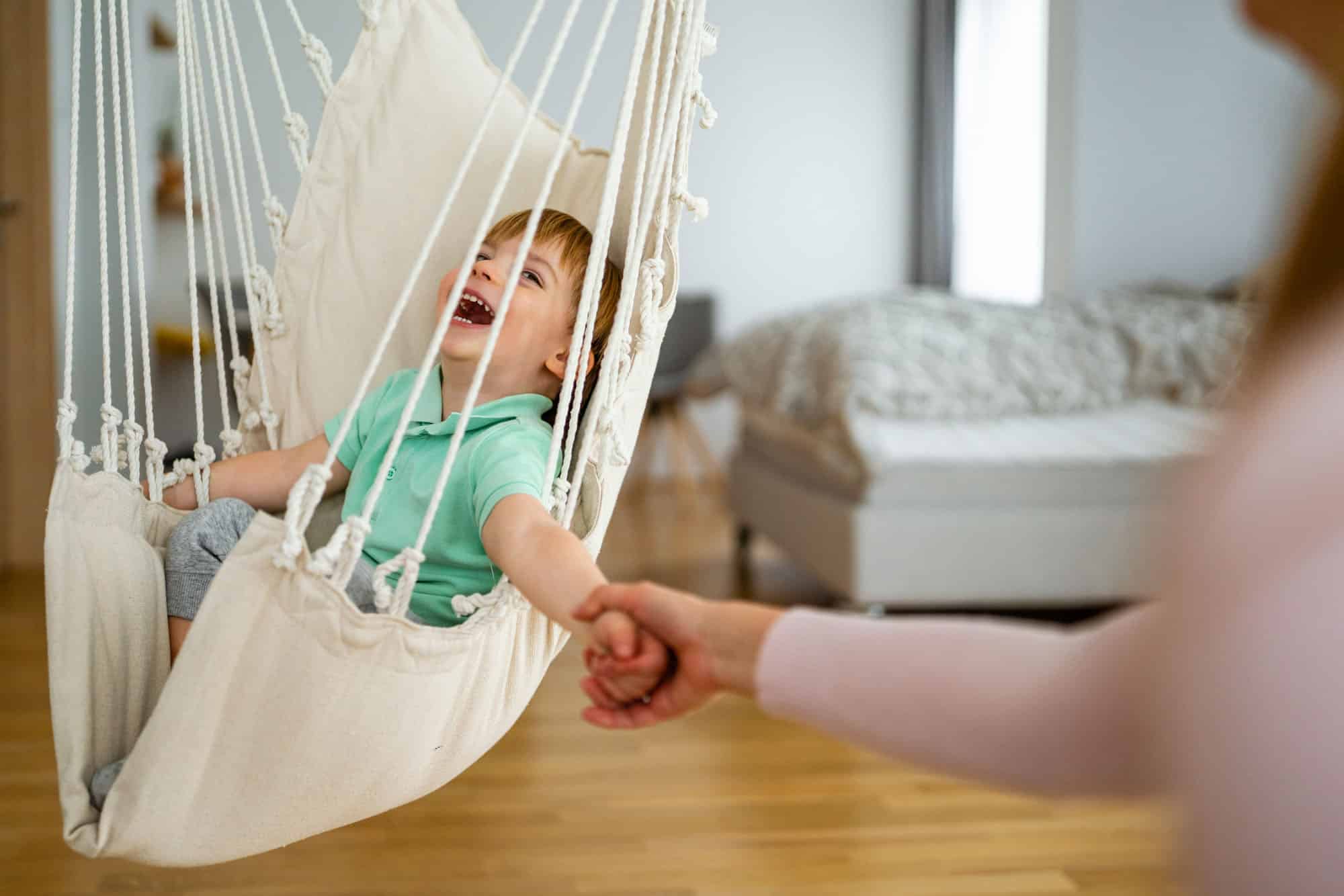 • Beautiful woman and her little son having fun, playing at home.